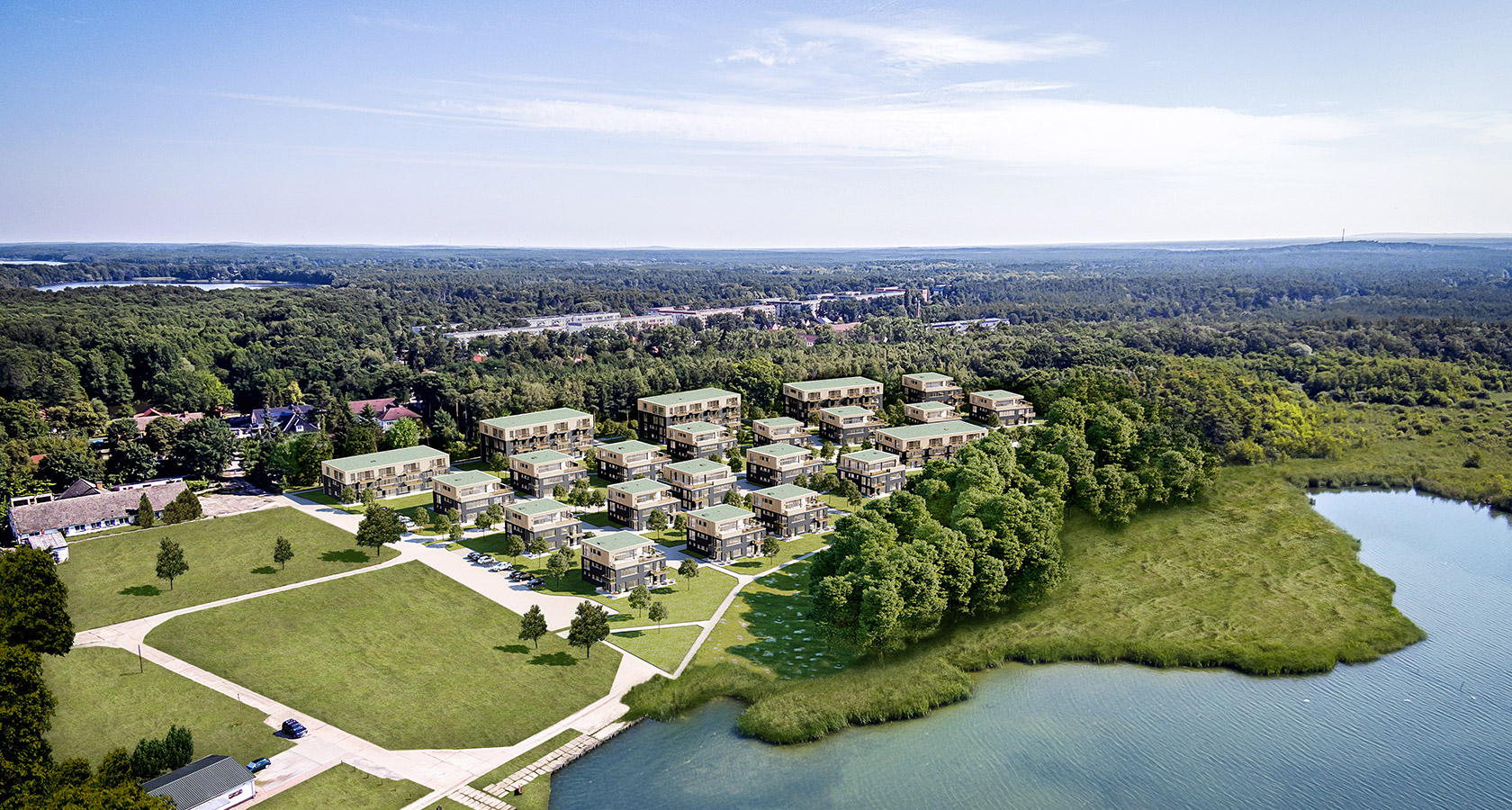 Am Pätzer See heißt die Oase, die Vitalität und Frische für jeden Tag verspricht. Die Lage am Wasser, eine natürliche Uferzone und viel Grün auf dem Grundstück prägen das Erscheinungsbild des großzügig geschnittenen Areals mit 53.000 m2. Davon sind ca. 13.000 m2 für den Bau von neun Mehrfamilienhäusern mit 49 exklusiven Eigentumswohnungen vorgesehen. Ergänzend zur Entstehung von Wohnraum plant der Projektentwickler in enger Abstimmung mit der Gemeinde Bestensee die Entwicklung der nahen Infrastruktur. (Schule, Kita, Ärztehaus, Einzelhandel)
